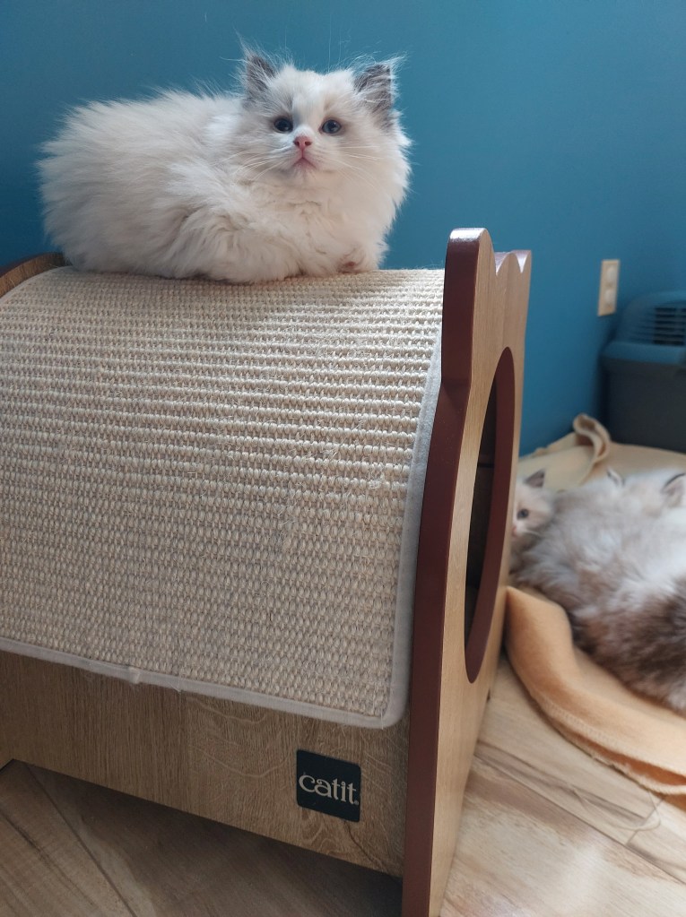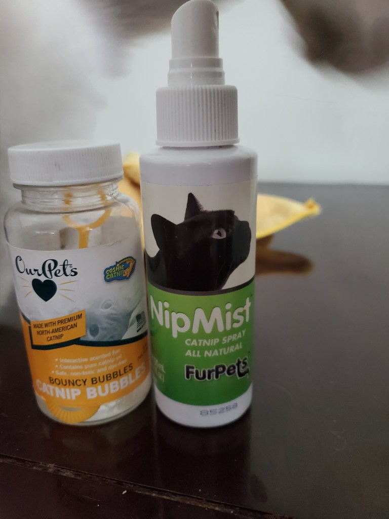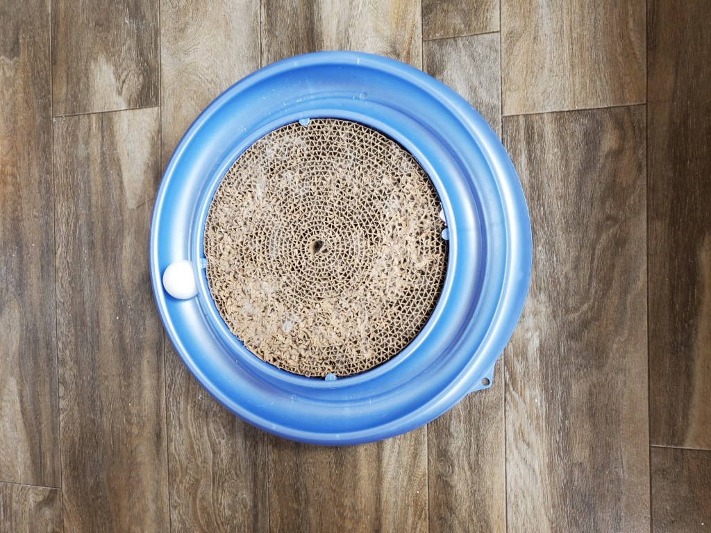 These toys provide hours of fun and can be purchased at almost every pet store. The blue one is great for kitten training to scratch cardboard. I like to use Catnip spray and spray the scratcher’s .